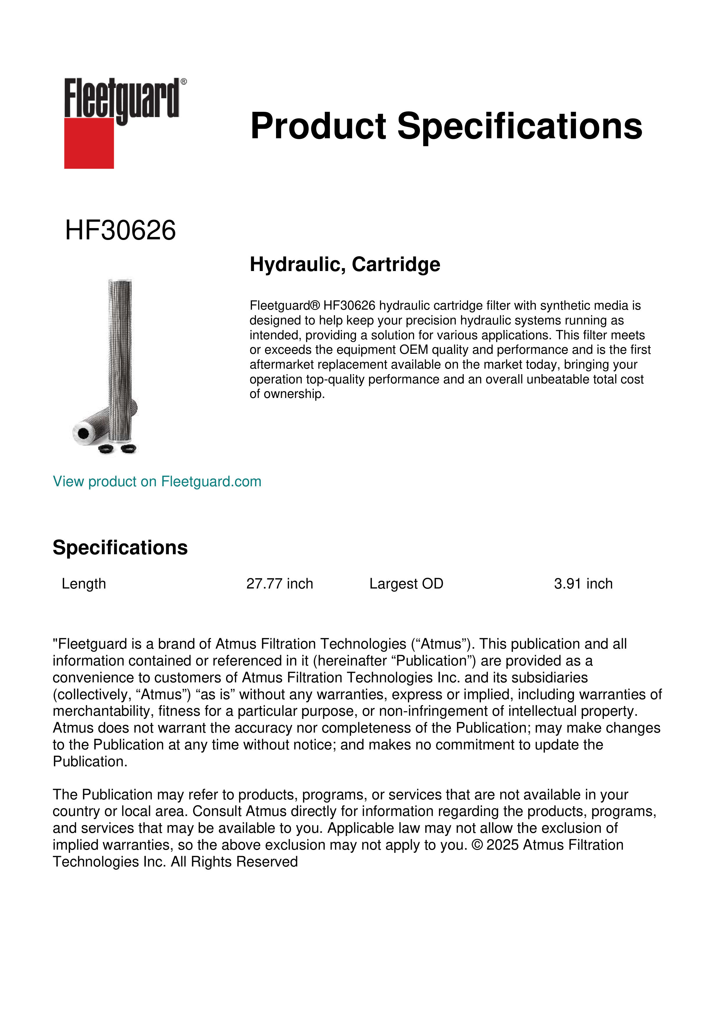 Fleetguard® HF30626 hydraulic cartridge filter with synthetic media is designed to help keep your precision hydraulic systems running as intended, providing a solution for various applications. This filter meets or exceeds the equipment OEM quality and performance and is the first aftermarket replacement available on the market today, bringing your operation top-quality performance and an overall unbeatable total cost of ownership.Specification