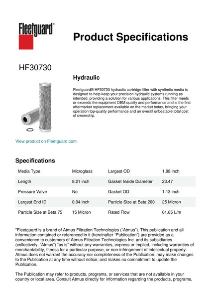 Fleetguard® HF30730 hydraulic cartridge filter with synthetic media is designed to help keep your precision hydraulic systems running as intended, providing a solution for various applications. This filter meets or exceeds the equipment OEM quality and performance and is the first aftermarket replacement available on the market today, bringing your operation top-quality performance and an overall unbeatable total cost of ownership.Specification