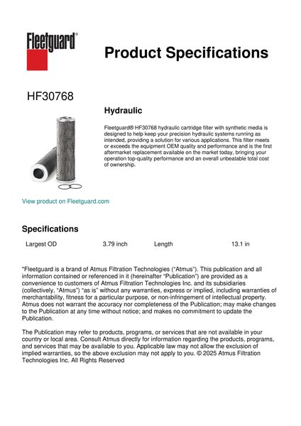 Fleetguard® HF30768 hydraulic cartridge filter with synthetic media is designed to help keep your precision hydraulic systems running as intended, providing a solution for various applications. This filter meets or exceeds the equipment OEM quality and performance and is the first aftermarket replacement available on the market today, bringing your operation top-quality performance and an overall unbeatable total cost of ownership.Specification