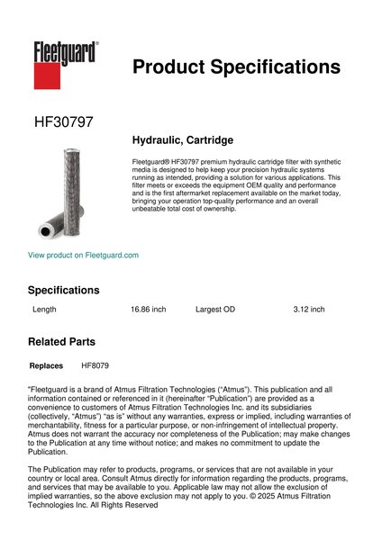 Fleetguard® HF30797 premium hydraulic cartridge filter with synthetic media is designed to help keep your precision hydraulic systems running as intended, providing a solution for various applications. This filter meets or exceeds the equipment OEM quality and performance and is the first aftermarket replacement available on the market today, bringing your operation top-quality performance and an overall unbeatable total cost of ownership.Specification