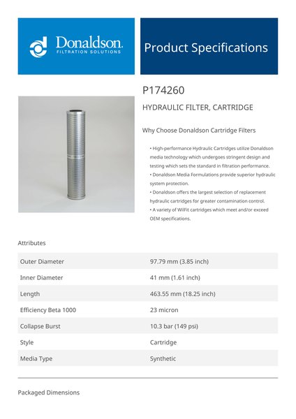 Genuine Donaldson P174260 Hydraulic Filter, Cartridge is designed to provide superior protection for your hydraulic system, effectively capturing contaminants to ensure clean fluid circulation. With high-quality filtration media, it extends equipment life, improves operational efficiency, and maintains fluid cleanliness even in the most demanding environments.