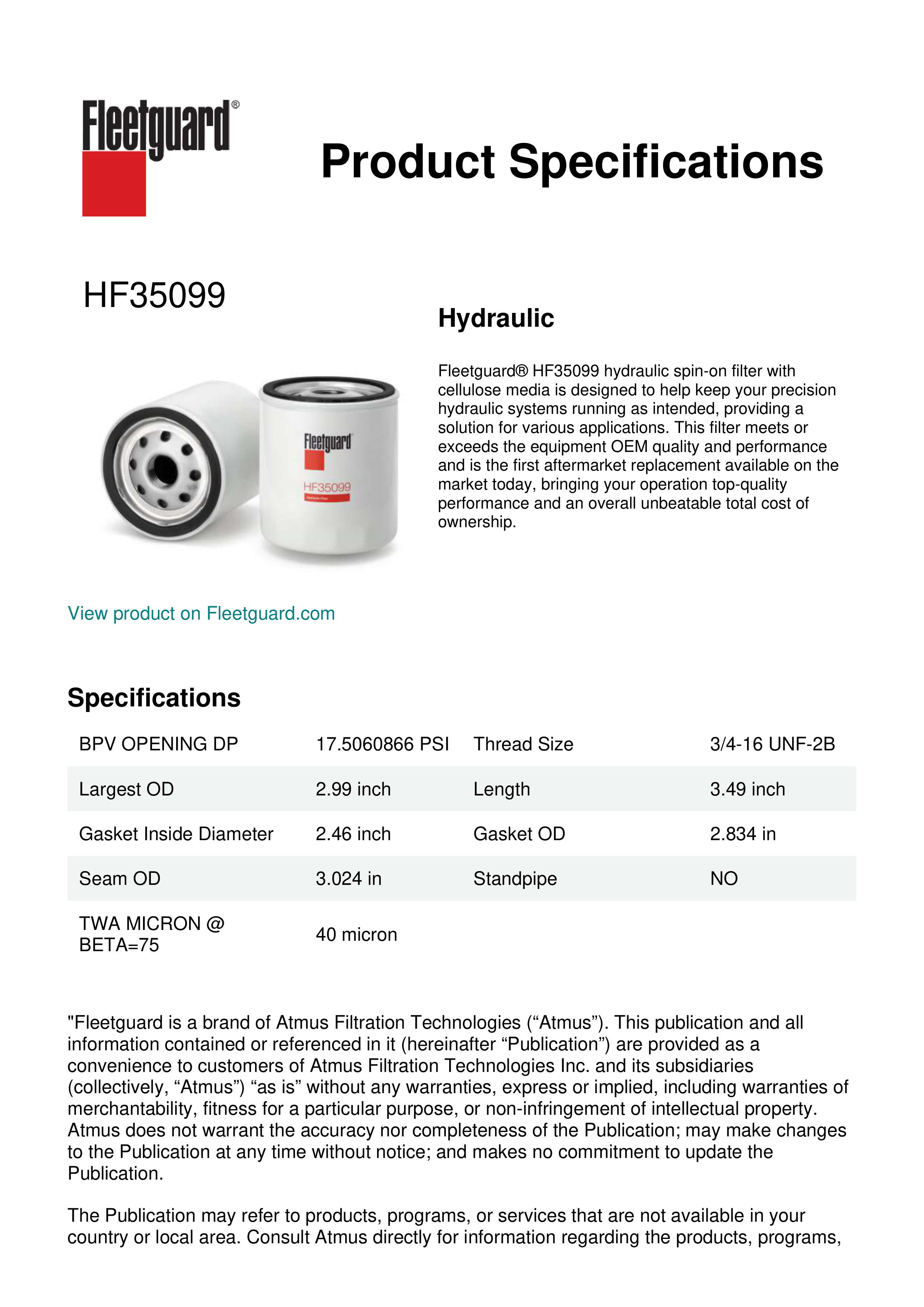 Fleetguard® HF35099 hydraulic spin-on filter with cellulose media is designed to help keep your precision hydraulic systems running as intended, providing a solution for various applications. This filter meets or exceeds the equipment OEM quality and performance and is the first aftermarket replacement available on the market today, bringing your operation top-quality performance and an overall unbeatable total cost of ownership.Specification