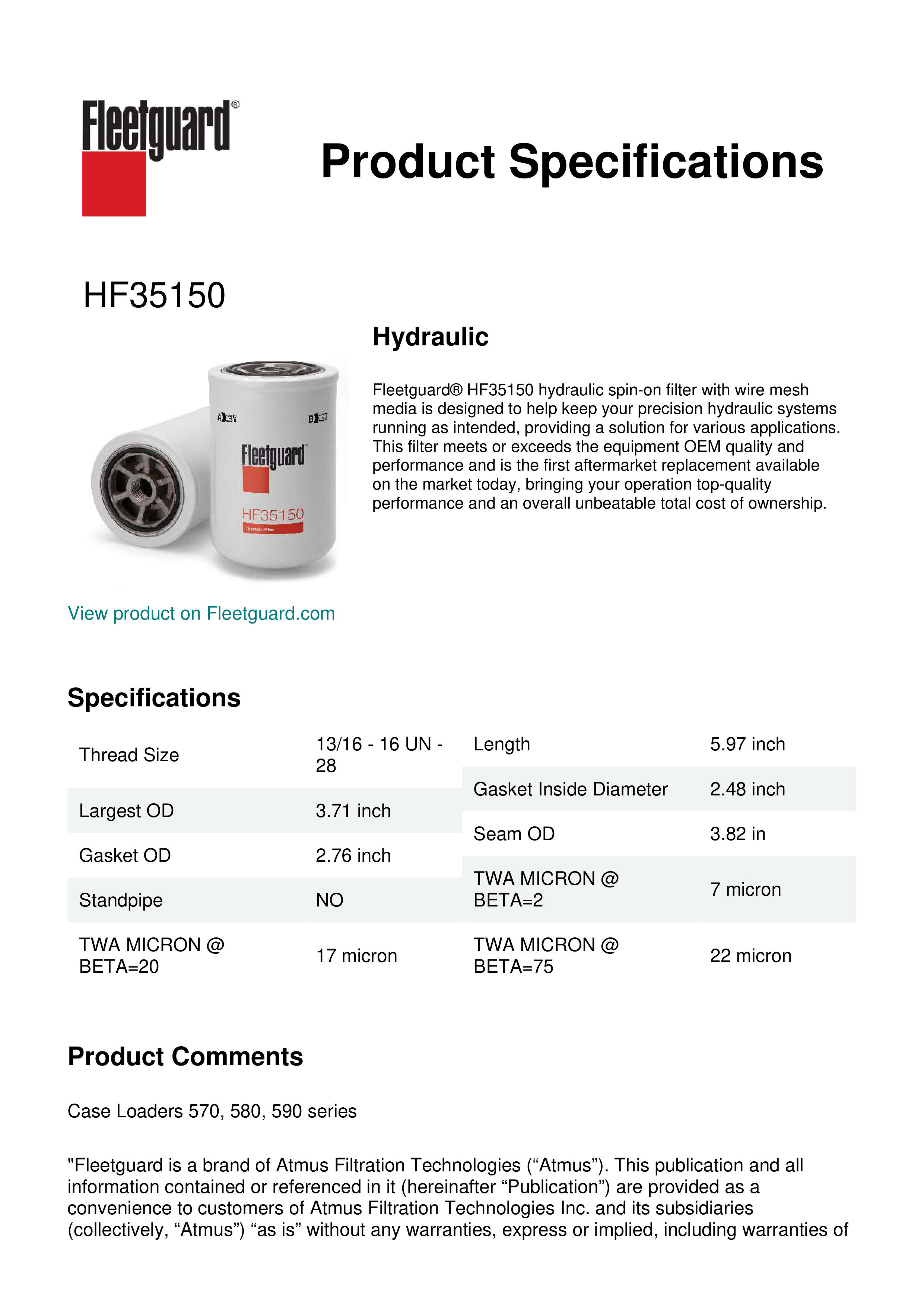 Fleetguard® HF35150 hydraulic spin-on filter with wire mesh media is designed to help keep your precision hydraulic systems running as intended, providing a solution for various applications. This filter meets or exceeds the equipment OEM quality and performance and is the first aftermarket replacement available on the market today, bringing your operation top-quality performance and an overall unbeatable total cost of ownership.Specification
