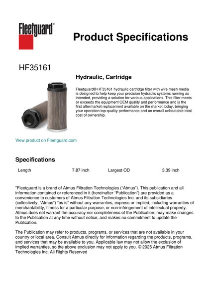 Fleetguard® HF35161 hydraulic cartridge filter with wire mesh media is designed to help keep your precision hydraulic systems running as intended, providing a solution for various applications. This filter meets or exceeds the equipment OEM quality and performance and is the first aftermarket replacement available on the market today, bringing your operation top-quality performance and an overall unbeatable total cost of ownership.Specification