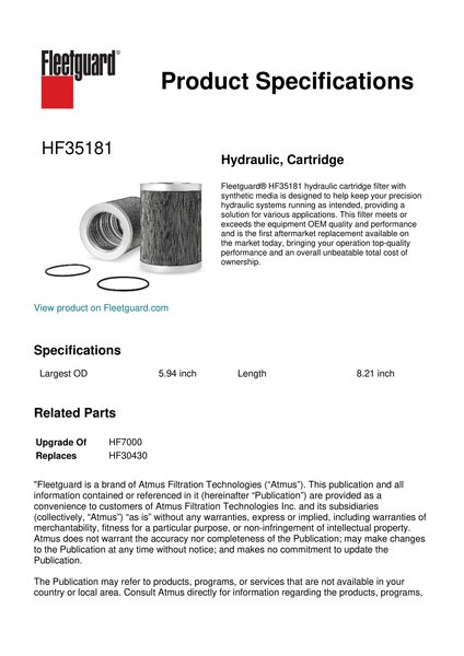 Fleetguard® HF35181 hydraulic cartridge filter with synthetic media is designed to help keep your precision hydraulic systems running as intended, providing a solution for various applications. This filter meets or exceeds the equipment OEM quality and performance and is the first aftermarket replacement available on the market today, bringing your operation top-quality performance and an overall unbeatable total cost of ownership.Specification