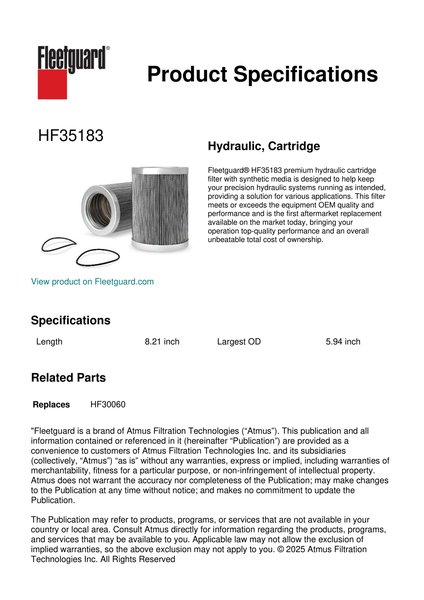 Fleetguard® HF35183 premium hydraulic cartridge filter with synthetic media is designed to help keep your precision hydraulic systems running as intended, providing a solution for various applications. This filter meets or exceeds the equipment OEM quality and performance and is the first aftermarket replacement available on the market today, bringing your operation top-quality performance and an overall unbeatable total cost of ownership.Specification