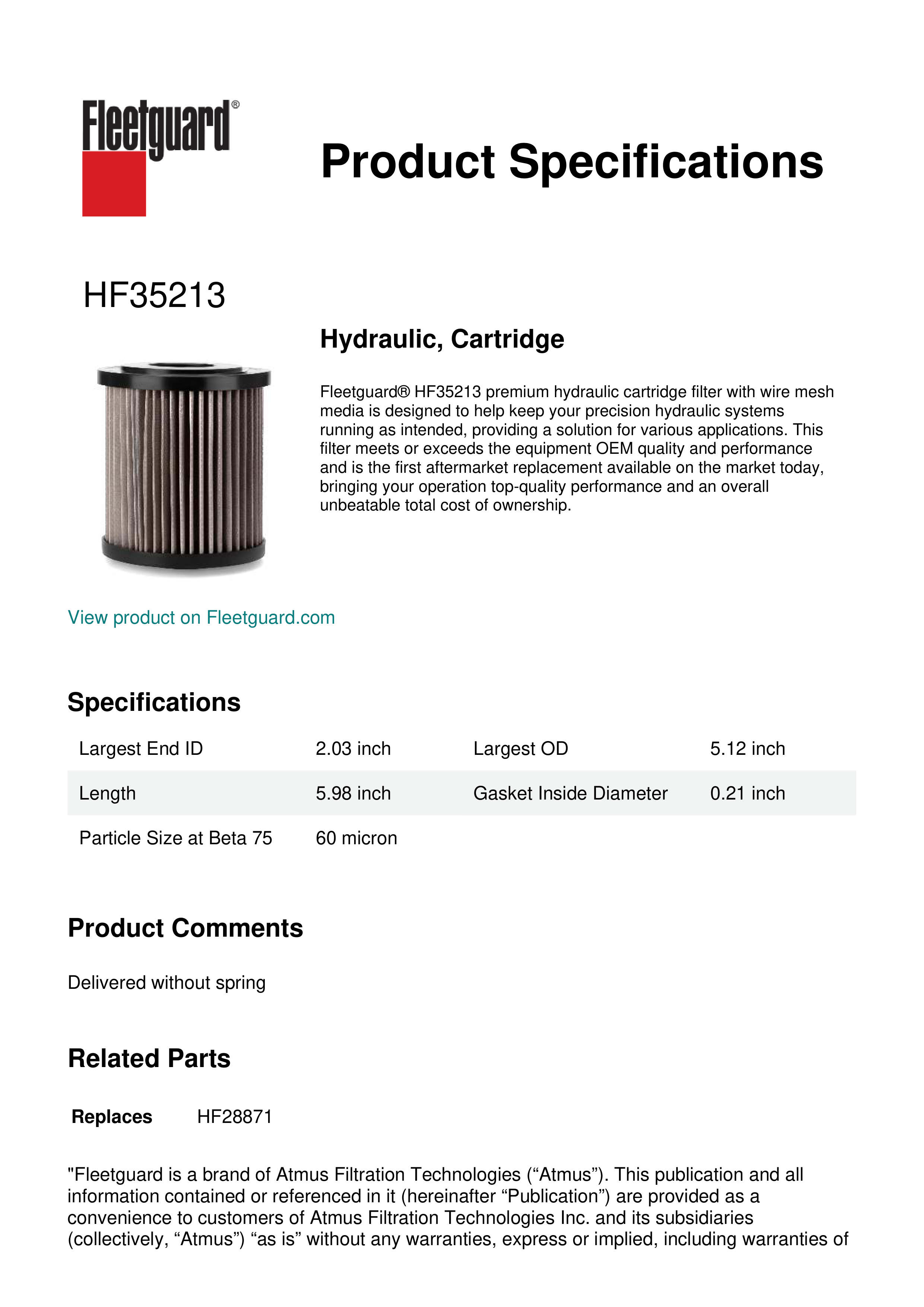 Fleetguard® HF35213 premium hydraulic cartridge filter with wire mesh media is designed to help keep your precision hydraulic systems running as intended, providing a solution for various applications. This filter meets or exceeds the equipment OEM quality and performance and is the first aftermarket replacement available on the market today, bringing your operation top-quality performance and an overall unbeatable total cost of ownership.Specification