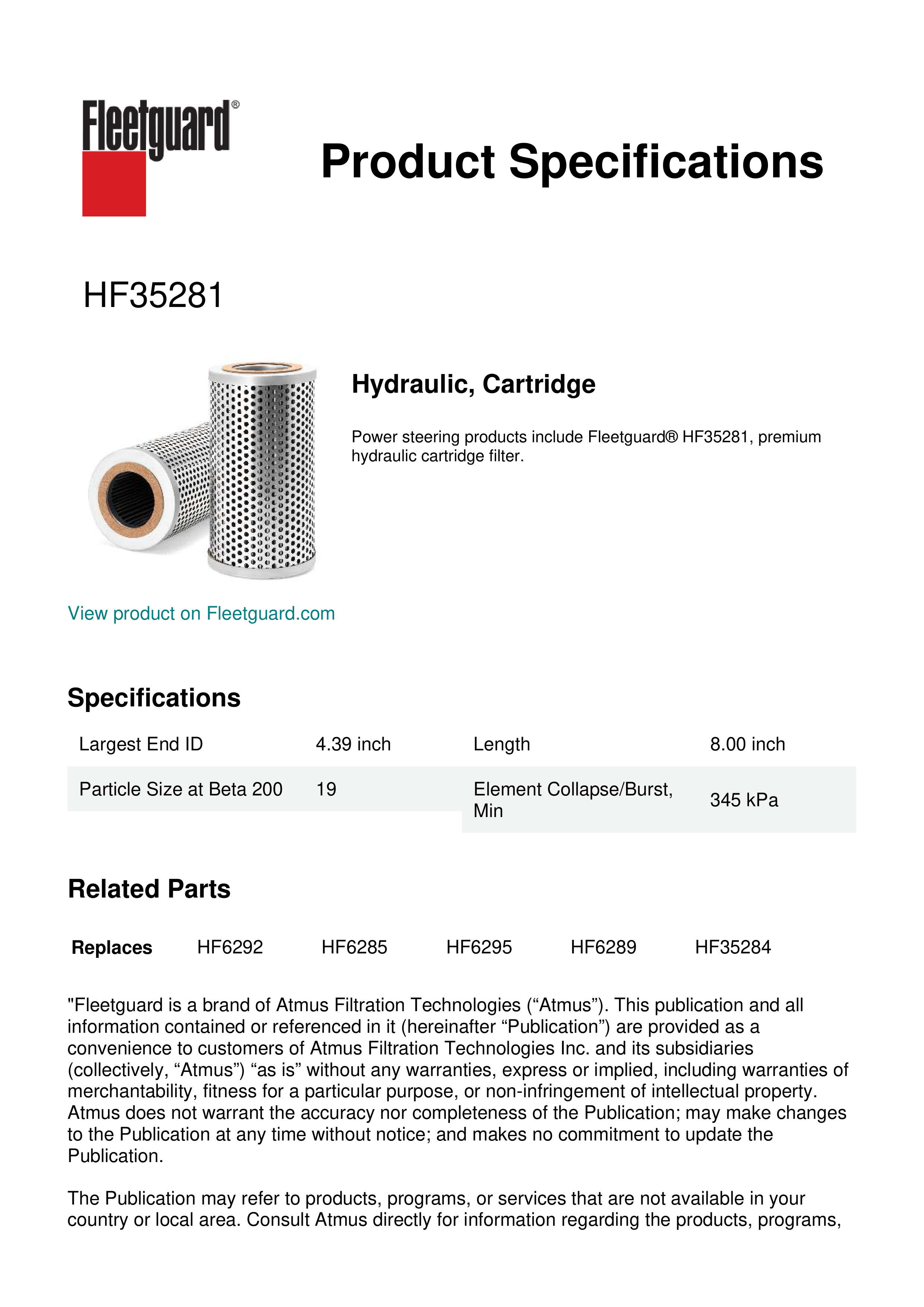 Power steering products include Fleetguard® HF35281, premium hydraulic cartridge filter.Specification