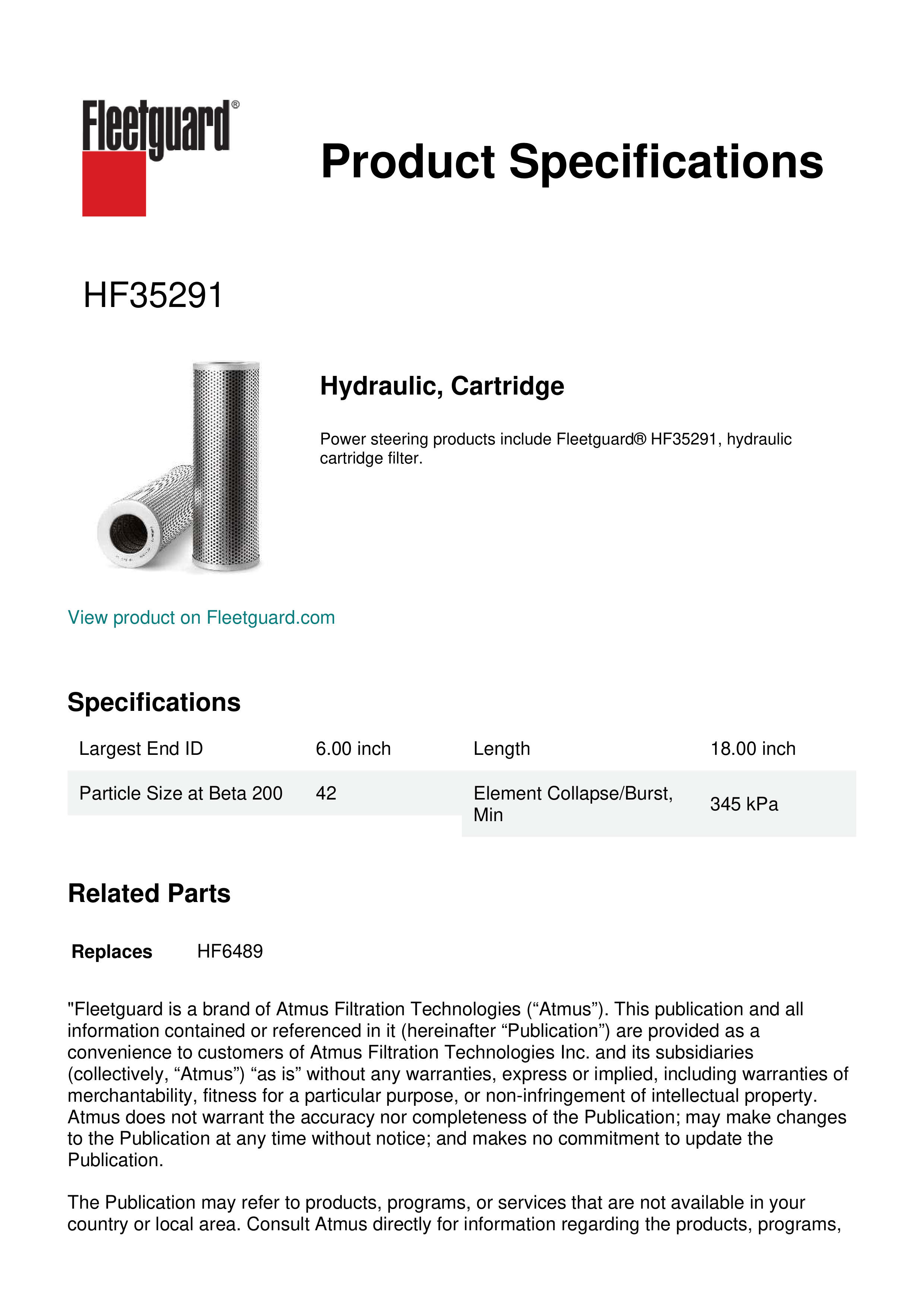 Power steering products include Fleetguard® HF35291, hydraulic cartridge filter.Specification