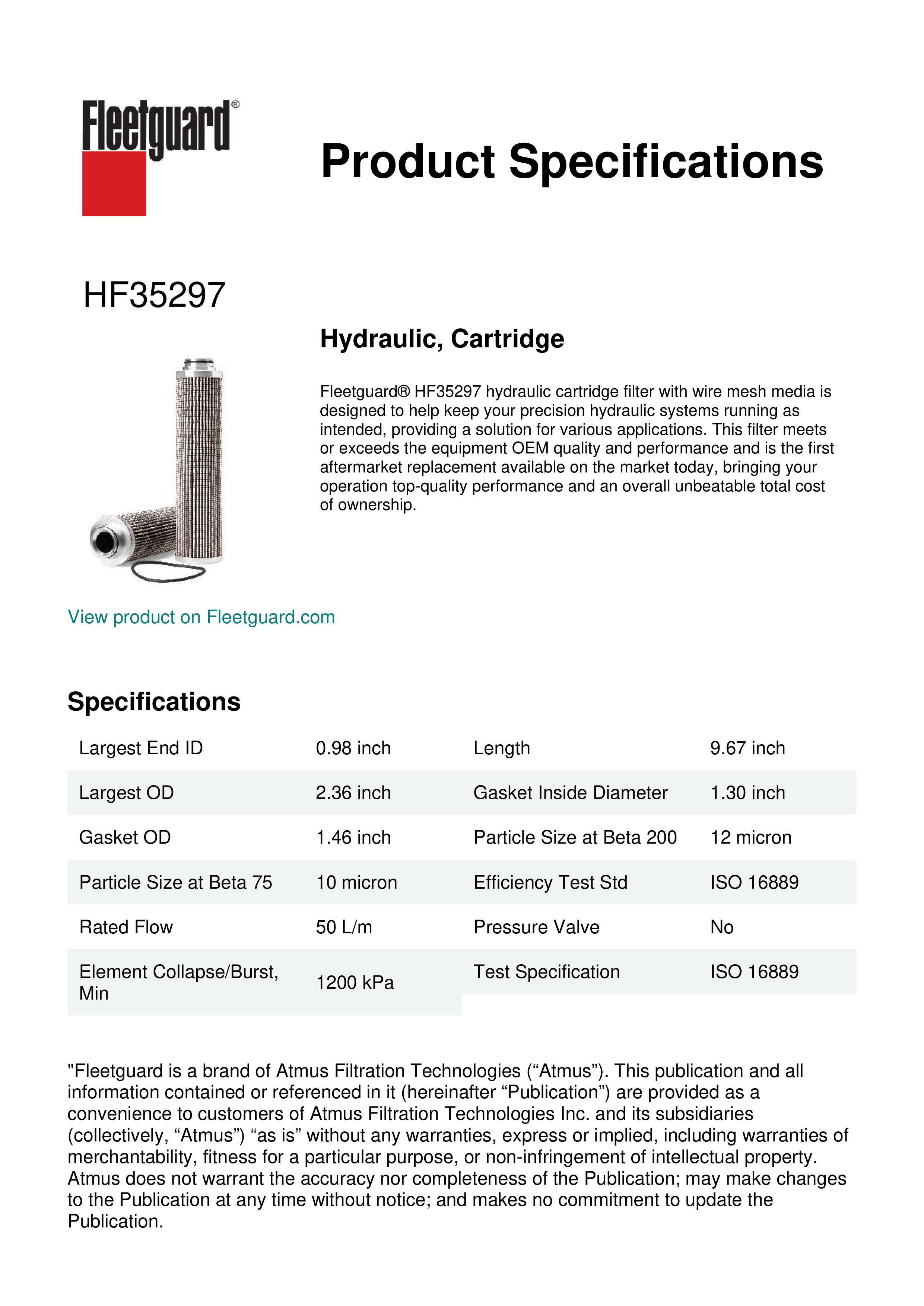 Fleetguard® HF35297 hydraulic cartridge filter with wire mesh media is designed to help keep your precision hydraulic systems running as intended, providing a solution for various applications. This filter meets or exceeds the equipment OEM quality and performance and is the first aftermarket replacement available on the market today, bringing your operation top-quality performance and an overall unbeatable total cost of ownership.Specification