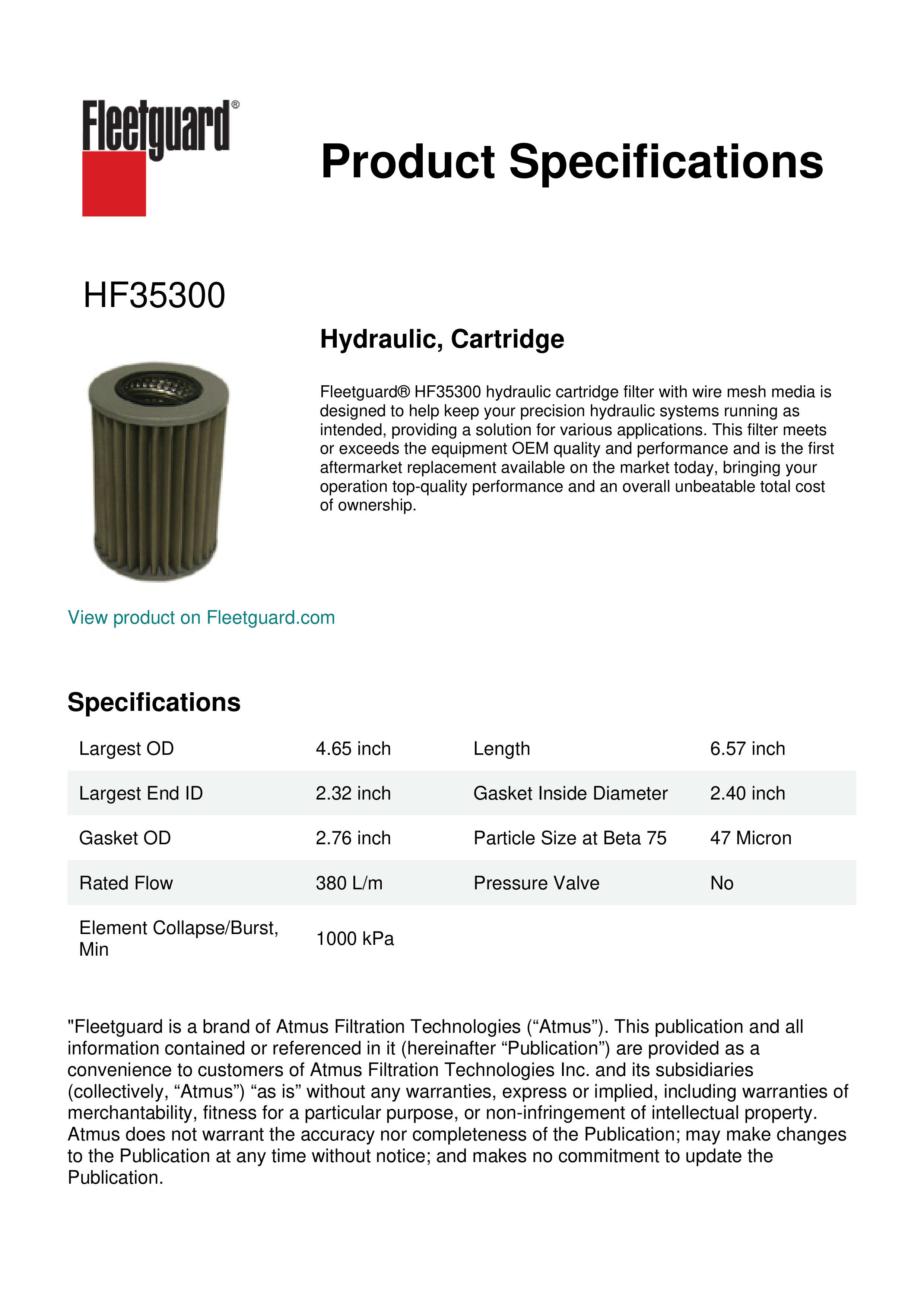 Fleetguard® HF35300 hydraulic cartridge filter with wire mesh media is designed to help keep your precision hydraulic systems running as intended, providing a solution for various applications. This filter meets or exceeds the equipment OEM quality and performance and is the first aftermarket replacement available on the market today, bringing your operation top-quality performance and an overall unbeatable total cost of ownership.Specification
