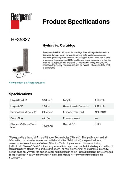 Fleetguard® HF35327 hydraulic cartridge filter with synthetic media is designed to help keep your precision hydraulic systems running as intended, providing a solution for various applications. This filter meets or exceeds the equipment OEM quality and performance and is the first aftermarket replacement available on the market today, bringing your operation top-quality performance and an overall unbeatable total cost of ownership.Specification