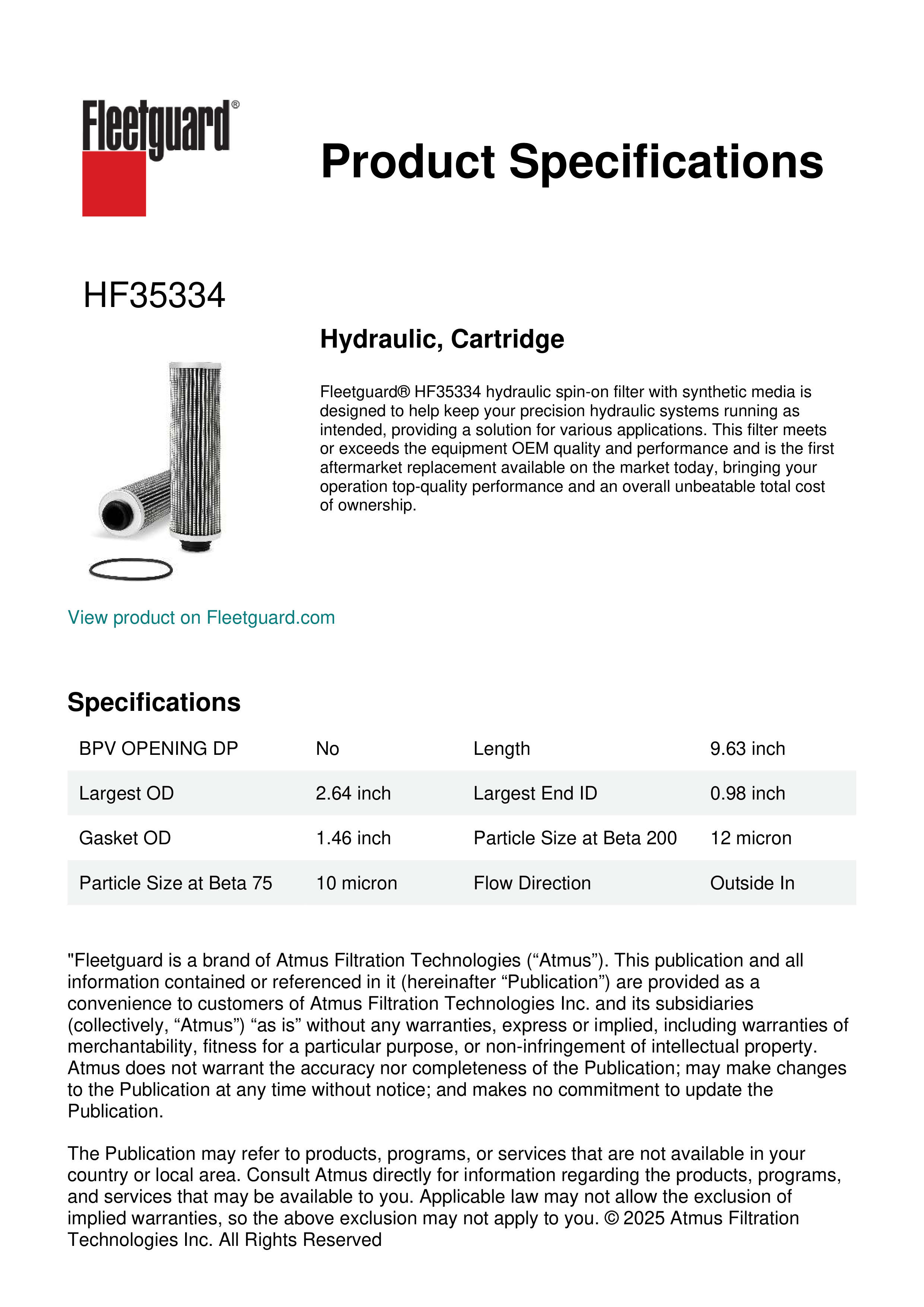 Fleetguard® HF35334 hydraulic spin-on filter with synthetic media is designed to help keep your precision hydraulic systems running as intended, providing a solution for various applications. This filter meets or exceeds the equipment OEM quality and performance and is the first aftermarket replacement available on the market today, bringing your operation top-quality performance and an overall unbeatable total cost of ownership.Specification