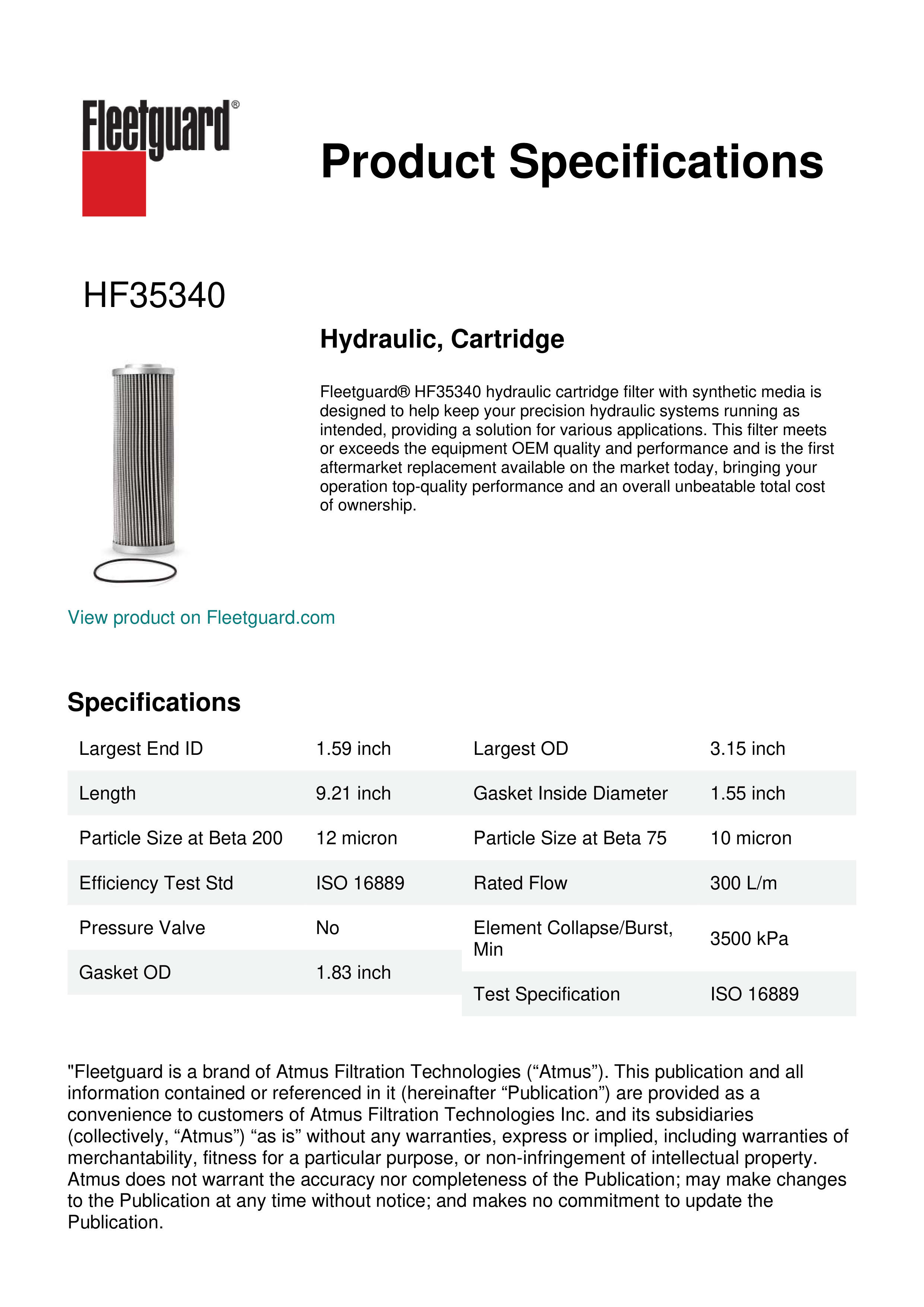 Fleetguard® HF35340 hydraulic cartridge filter with synthetic media is designed to help keep your precision hydraulic systems running as intended, providing a solution for various applications. This filter meets or exceeds the equipment OEM quality and performance and is the first aftermarket replacement available on the market today, bringing your operation top-quality performance and an overall unbeatable total cost of ownership.Specification