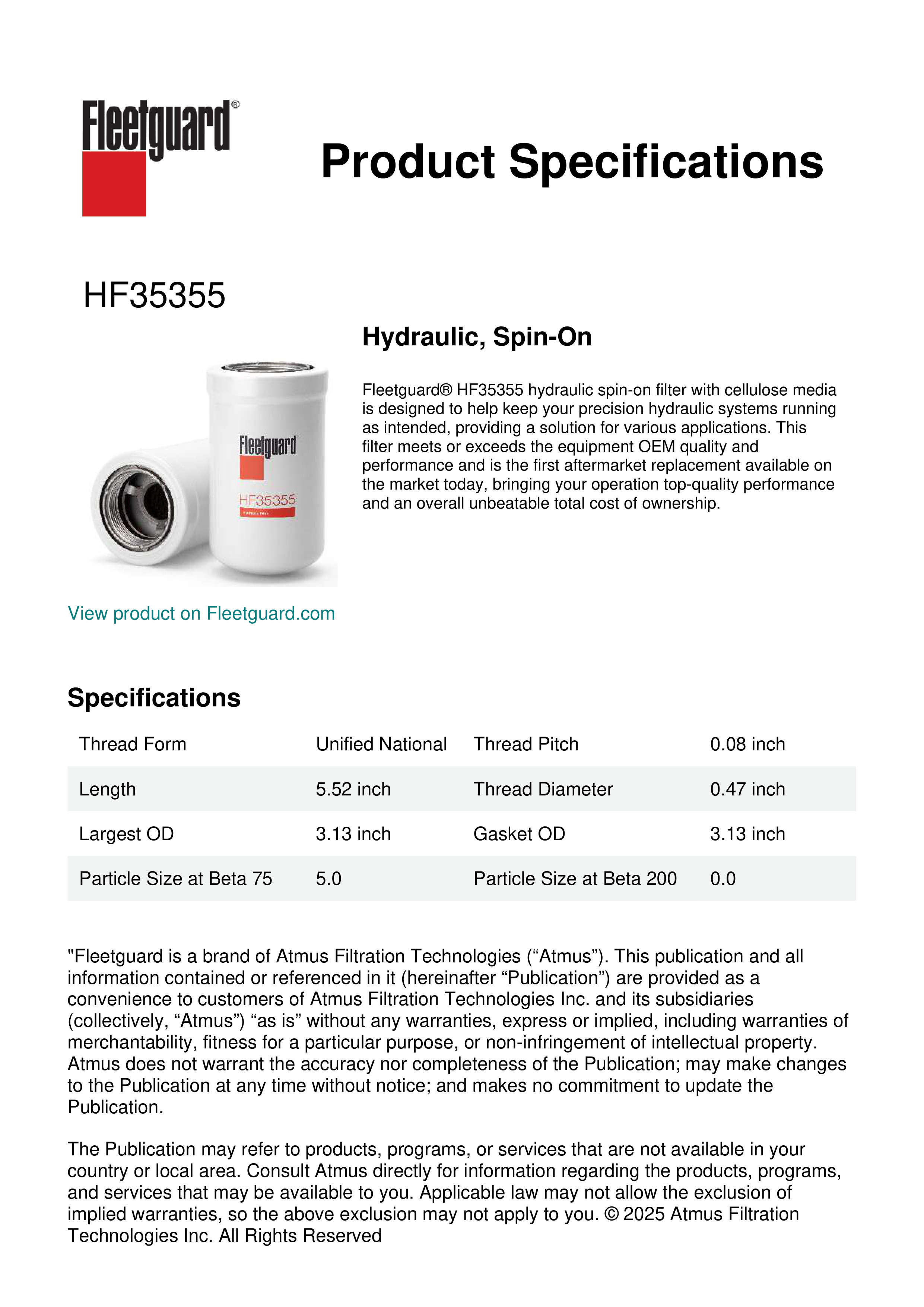 Fleetguard® HF35355 hydraulic spin-on filter with cellulose media is designed to help keep your precision hydraulic systems running as intended, providing a solution for various applications. This filter meets or exceeds the equipment OEM quality and performance and is the first aftermarket replacement available on the market today, bringing your operation top-quality performance and an overall unbeatable total cost of ownership.Specification