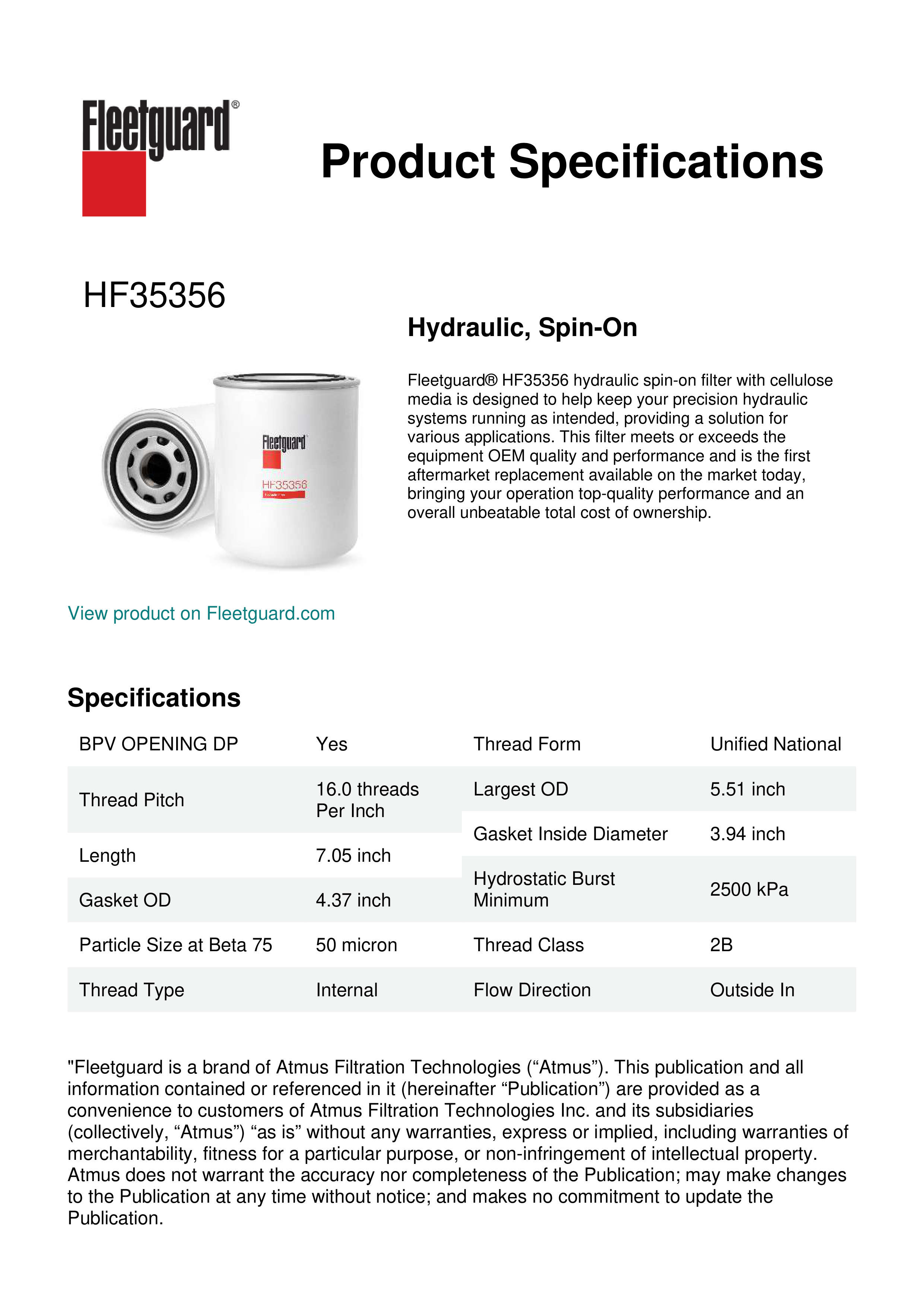 Fleetguard® HF35356 hydraulic spin-on filter with cellulose media is designed to help keep your precision hydraulic systems running as intended, providing a solution for various applications. This filter meets or exceeds the equipment OEM quality and performance and is the first aftermarket replacement available on the market today, bringing your operation top-quality performance and an overall unbeatable total cost of ownership.Specification