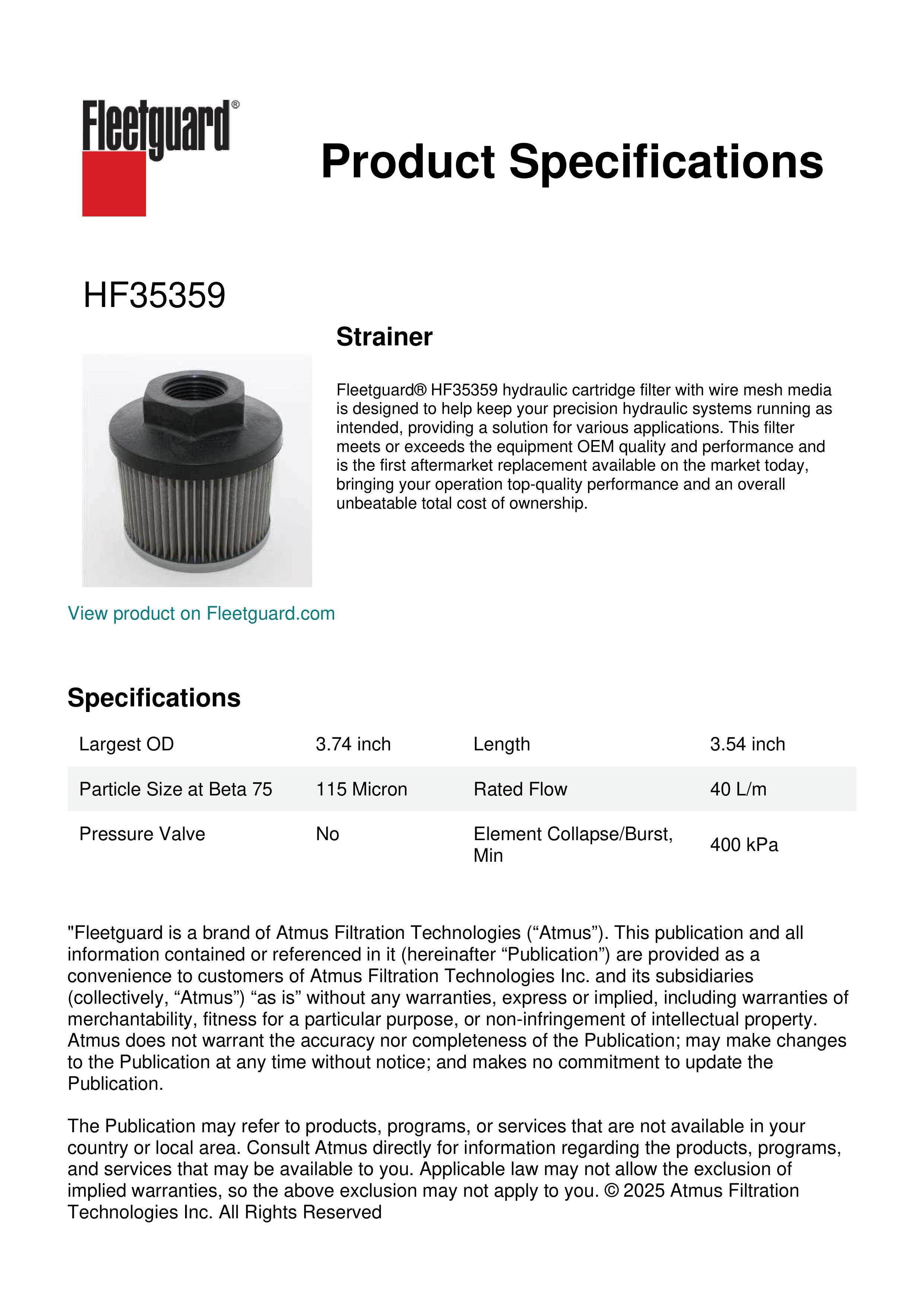 Fleetguard® HF35359 hydraulic cartridge filter with wire mesh media is designed to help keep your precision hydraulic systems running as intended, providing a solution for various applications. This filter meets or exceeds the equipment OEM quality and performance and is the first aftermarket replacement available on the market today, bringing your operation top-quality performance and an overall unbeatable total cost of ownership.Specification