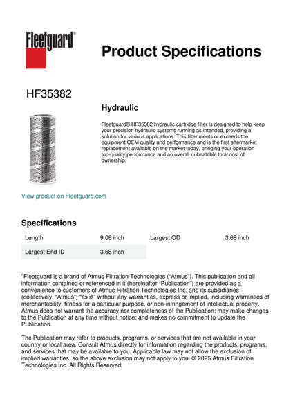 Fleetguard® HF35382 hydraulic cartridge filter is designed to help keep your precision hydraulic systems running as intended, providing a solution for various applications. This filter meets or exceeds the equipment OEM quality and performance and is the first aftermarket replacement available on the market today, bringing your operation top-quality performance and an overall unbeatable total cost of ownership.