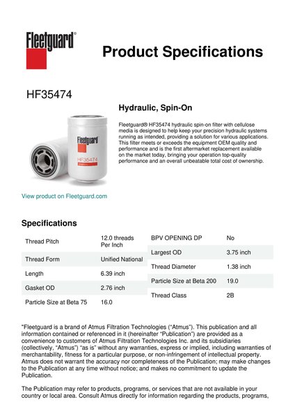 Fleetguard® HF35474 hydraulic spin-on filter with cellulose media is designed to help keep your precision hydraulic systems running as intended, providing a solution for various applications. This filter meets or exceeds the equipment OEM quality and performance and is the first aftermarket replacement available on the market today, bringing your operation top-quality performance and an overall unbeatable total cost of ownership.Specification