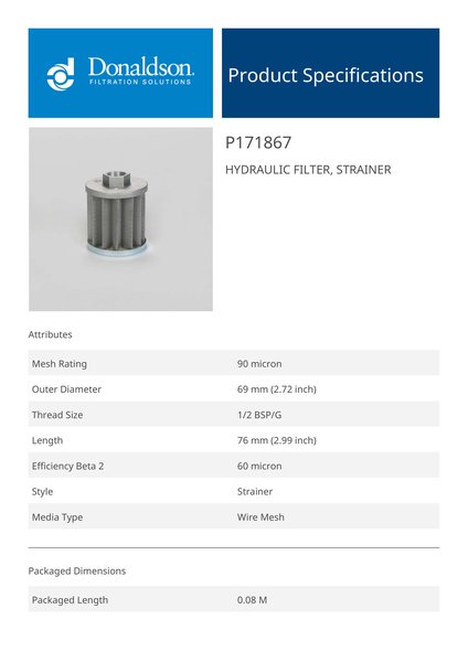 Genuine Donaldson P171867 Hydraulic Filter, Strainer is designed to capture larger contaminants before they enter the hydraulic system, protecting sensitive components from damage. Its coarse filtration capability helps extend the life of downstream filters and improves overall system performance.Ideal for low-pressure applications, this strainer offers durable construction and easy installation. It’s a cost-effective solution for maintaining hydraulic fluid cleanliness and preventing clogging in pumps and valves.