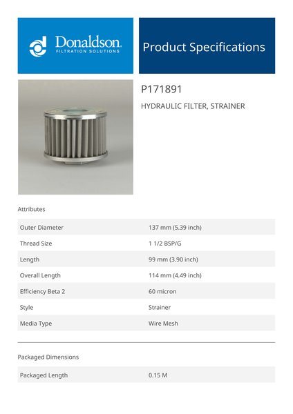 Genuine Donaldson P171891 Hydraulic Filter, Strainer is designed to capture larger contaminants before they enter the hydraulic system, protecting sensitive components from damage. Its coarse filtration capability helps extend the life of downstream filters and improves overall system performance.Ideal for low-pressure applications, this strainer offers durable construction and easy installation. It’s a cost-effective solution for maintaining hydraulic fluid cleanliness and preventing clogging in pumps and valves.