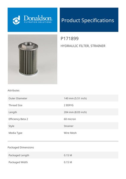 Genuine Donaldson P171899 Hydraulic Filter, Strainer is designed to capture larger contaminants before they enter the hydraulic system, protecting sensitive components from damage. Its coarse filtration capability helps extend the life of downstream filters and improves overall system performance.Ideal for low-pressure applications, this strainer offers durable construction and easy installation. It’s a cost-effective solution for maintaining hydraulic fluid cleanliness and preventing clogging in pumps and valves.