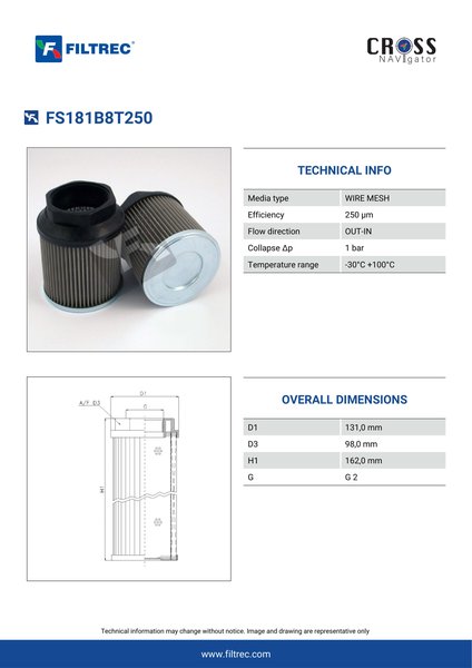 Genuine Filtrec FS181B8T250. This Filtrec element is designed to meet or exceed the quality and performance of brand OEM’s ensuring superior filtration performance and long-lasting durability.Engineered with their high performance media and a durable design, the FS181B8T250 provides reliable and consistent performance over its lifespan, even in harsh operating environments. When you order from FilterFinder, you can trust that you are getting a reliable and high-quality replacement filter that will keep your system running smoothly.