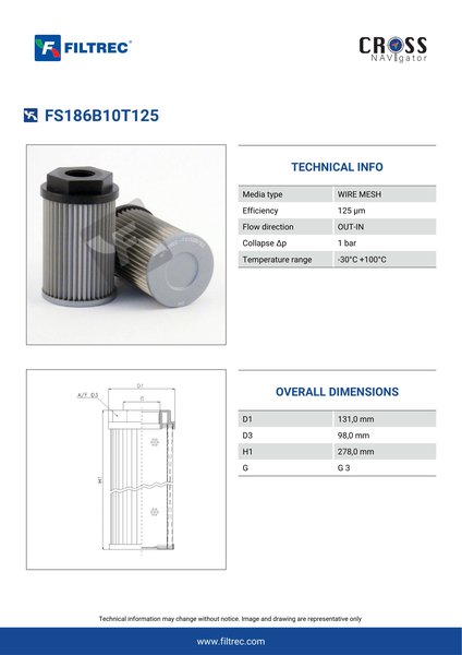 Genuine Filtrec FS186B10T125. This Filtrec element is designed to meet or exceed the quality and performance of brand OEM’s ensuring superior filtration performance and long-lasting durability.Engineered with their high performance media and a durable design, the FS186B10T125 provides reliable and consistent performance over its lifespan, even in harsh operating environments. When you order from FilterFinder, you can trust that you are getting a reliable and high-quality replacement filter that will keep your system running smoothly.