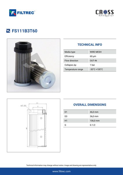 Genuine Filtrec FS111B3T60. This Filtrec element is designed to meet or exceed the quality and performance of brand OEM’s ensuring superior filtration performance and long-lasting durability.