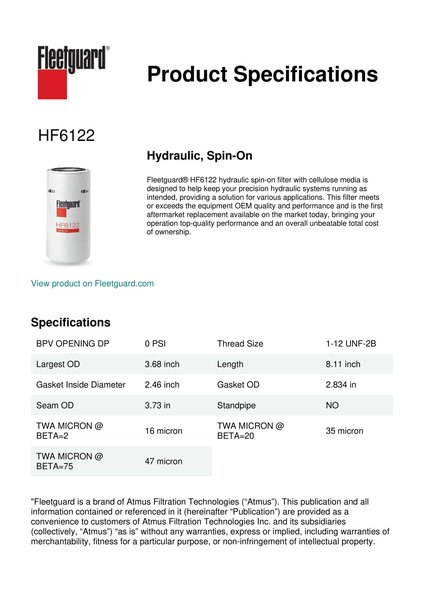 Fleetguard® HF6122 hydraulic spin-on filter with cellulose media is designed to help keep your precision hydraulic systems running as intended, providing a solution for various applications. This filter meets or exceeds the equipment OEM quality and performance and is the first aftermarket replacement available on the market today, bringing your operation top-quality performance and an overall unbeatable total cost of ownership.Specification