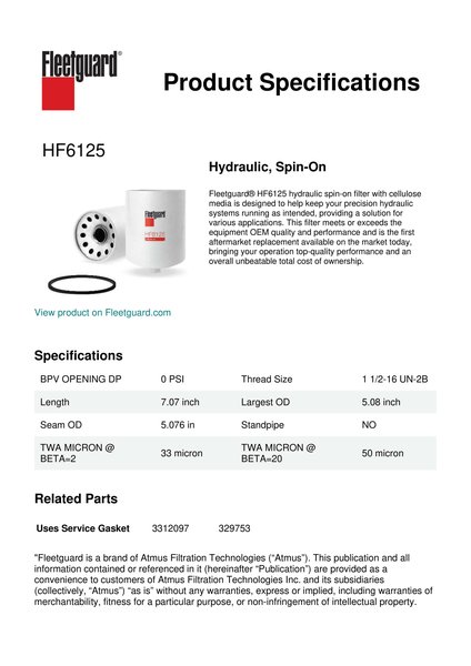 Fleetguard® HF6125 hydraulic spin-on filter with cellulose media is designed to help keep your precision hydraulic systems running as intended, providing a solution for various applications. This filter meets or exceeds the equipment OEM quality and performance and is the first aftermarket replacement available on the market today, bringing your operation top-quality performance and an overall unbeatable total cost of ownership.Specification