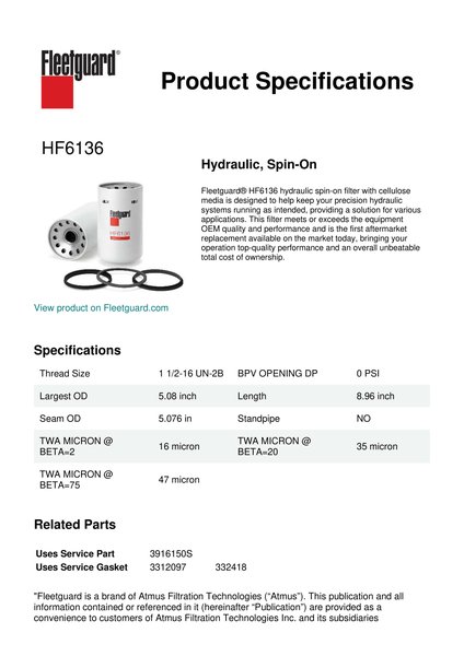 Fleetguard® HF6136 hydraulic spin-on filter with cellulose media is designed to help keep your precision hydraulic systems running as intended, providing a solution for various applications. This filter meets or exceeds the equipment OEM quality and performance and is the first aftermarket replacement available on the market today, bringing your operation top-quality performance and an overall unbeatable total cost of ownership.Specification