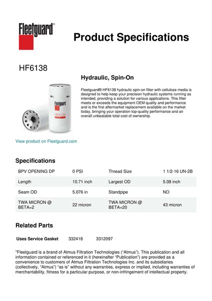 Fleetguard® HF6138 hydraulic spin-on filter with cellulose media is designed to help keep your precision hydraulic systems running as intended, providing a solution for various applications. This filter meets or exceeds the equipment OEM quality and performance and is the first aftermarket replacement available on the market today, bringing your operation top-quality performance and an overall unbeatable total cost of ownership.Specification
