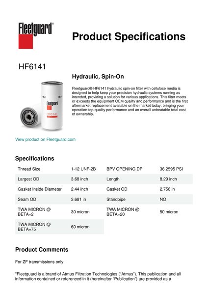 Fleetguard® HF6141 hydraulic spin-on filter with cellulose media is designed to help keep your precision hydraulic systems running as intended, providing a solution for various applications. This filter meets or exceeds the equipment OEM quality and performance and is the first aftermarket replacement available on the market today, bringing your operation top-quality performance and an overall unbeatable total cost of ownership.Specification