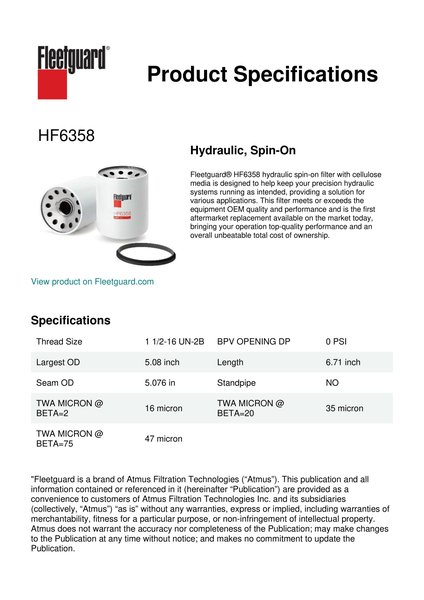 Fleetguard® HF6358 hydraulic spin-on filter with cellulose media is designed to help keep your precision hydraulic systems running as intended, providing a solution for various applications. This filter meets or exceeds the equipment OEM quality and performance and is the first aftermarket replacement available on the market today, bringing your operation top-quality performance and an overall unbeatable total cost of ownership.Specification