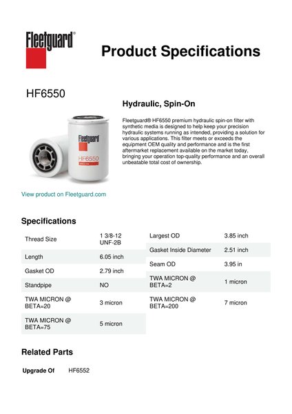 Fleetguard® HF6550 premium hydraulic spin-on filter with synthetic media is designed to help keep your precision hydraulic systems running as intended, providing a solution for various applications. This filter meets or exceeds the equipment OEM quality and performance and is the first aftermarket replacement available on the market today, bringing your operation top-quality performance and an overall unbeatable total cost of ownership.Specification