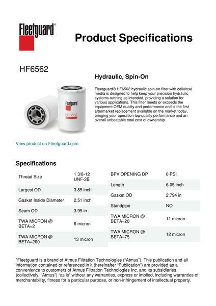 Fleetguard® HF6562 hydraulic spin-on filter with cellulose media is designed to help keep your precision hydraulic systems running as intended, providing a solution for various applications. This filter meets or exceeds the equipment OEM quality and performance and is the first aftermarket replacement available on the market today, bringing your operation top-quality performance and an overall unbeatable total cost of ownership.Specification