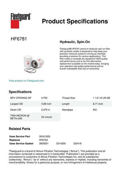 Fleetguard® HF6781 premium hydraulic spin-on filter with synthetic media is designed to help keep your precision hydraulic systems running as intended, providing a solution for various applications. This filter meets or exceeds the equipment OEM quality and performance and is the first aftermarket replacement available on the market today, bringing your operation top-quality performance and an overall unbeatable total cost of ownership.Specification