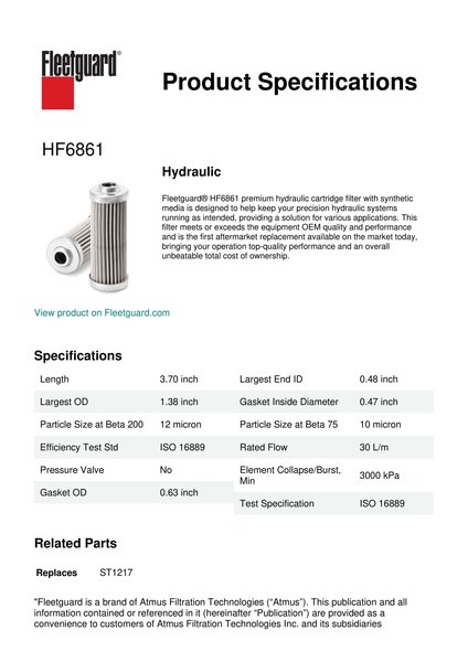 Fleetguard® HF6861 premium hydraulic cartridge filter with synthetic media is designed to help keep your precision hydraulic systems running as intended, providing a solution for various applications. This filter meets or exceeds the equipment OEM quality and performance and is the first aftermarket replacement available on the market today, bringing your operation top-quality performance and an overall unbeatable total cost of ownership.Specification