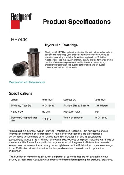 Fleetguard® HF7444 hydraulic cartridge filter with wire mesh media is designed to help keep your precision hydraulic systems running as intended, providing a solution for various applications. This filter meets or exceeds the equipment OEM quality and performance and is the first aftermarket replacement available on the market today, bringing your operation top-quality performance and an overall unbeatable total cost of ownership.Specification