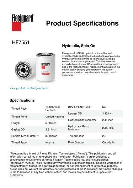 Fleetguard® HF7551 hydraulic spin-on filter with synthetic media is designed to help keep your precision hydraulic systems running as intended, providing a solution for various applications. This filter meets or exceeds the equipment OEM quality and performance and is the first aftermarket replacement available on the market today, bringing your operation top-quality performance and an overall unbeatable total cost of ownership.Specification
