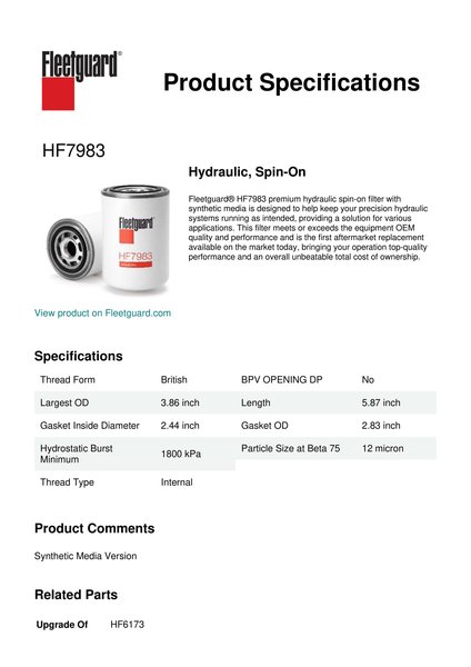 Fleetguard® HF7983 premium hydraulic spin-on filter with synthetic media is designed to help keep your precision hydraulic systems running as intended, providing a solution for various applications. This filter meets or exceeds the equipment OEM quality and performance and is the first aftermarket replacement available on the market today, bringing your operation top-quality performance and an overall unbeatable total cost of ownership.Specification