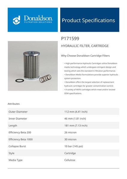 Genuine Donaldson P171599 Hydraulic Filter, Cartridge is designed to provide superior protection for your hydraulic system, effectively capturing contaminants to ensure clean fluid circulation. With high-quality filtration media, it extends equipment life, improves operational efficiency, and maintains fluid cleanliness even in the most demanding environments.