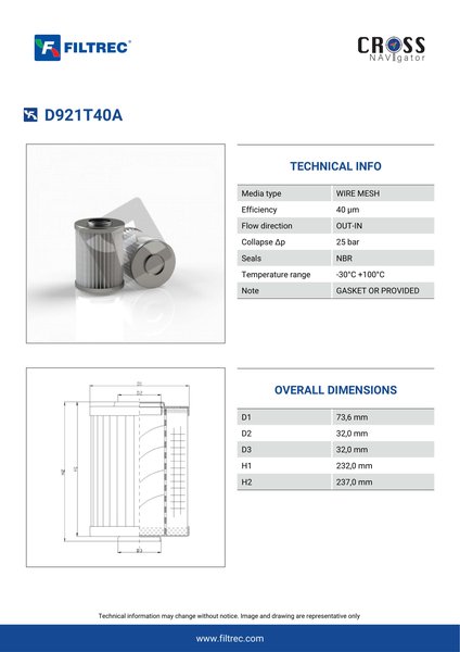 Genuine Filtrec D921T40A. This Filtrec element is designed to meet or exceed the quality and performance of brand OEM’s ensuring superior filtration performance and long-lasting durability.