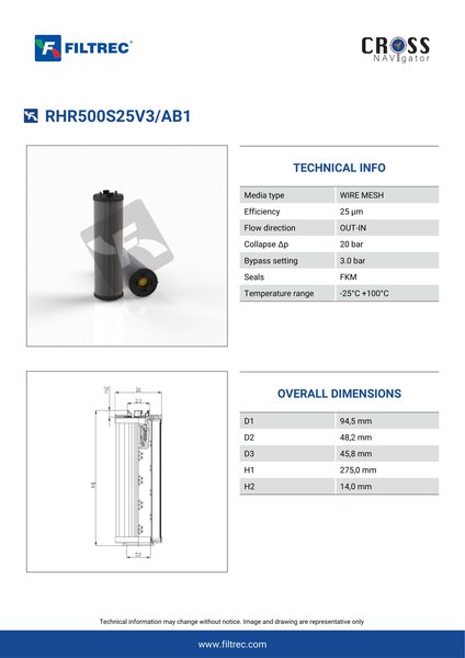 Genuine Filtrec RHR500S25V3/AB1. This Filtrec element is designed to meet or exceed the quality and performance of brand OEM’s ensuring superior filtration performance and long-lasting durability.Engineered with their high performance media and a durable design, the RHR500S25V3/AB1 provides reliable and consistent performance over its lifespan, even in harsh operating environments. When you order from FilterFinder, you can trust that you are getting a reliable and high-quality replacement filter that will keep your system running smoothly.