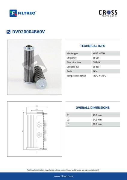 Genuine Filtrec DVD20004B60V. This Filtrec element is designed to meet or exceed the quality and performance of brand OEM’s ensuring superior filtration performance and long-lasting durability.