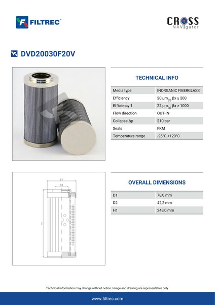 Genuine Filtrec DVD20030F20V. This Filtrec element is designed to meet or exceed the quality and performance of brand OEM’s ensuring superior filtration performance and long-lasting durability.