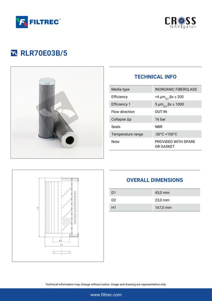 Genuine Filtrec RLR70E03B/5. This Filtrec element is designed to meet or exceed the quality and performance of brand OEM’s ensuring superior filtration performance and long-lasting durability.
