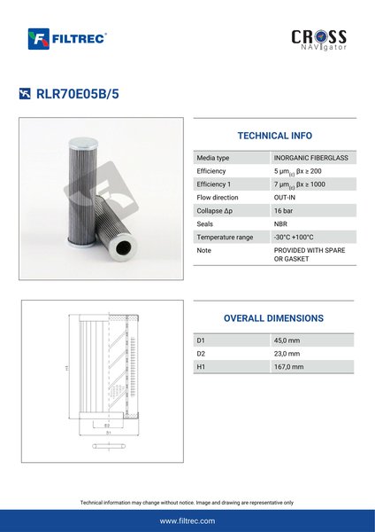 Genuine Filtrec RLR70E05B/5. This Filtrec element is designed to meet or exceed the quality and performance of brand OEM’s ensuring superior filtration performance and long-lasting durability.