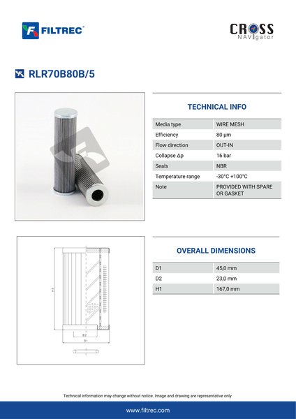 Genuine Filtrec RLR70B80B/5. This Filtrec element is designed to meet or exceed the quality and performance of brand OEM’s ensuring superior filtration performance and long-lasting durability.